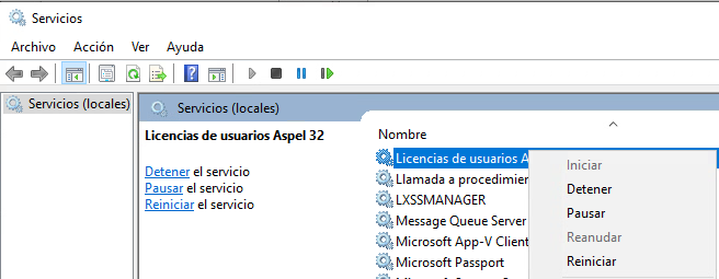 - Si con esto no queda, Reinicia el servidor de licencias Aspel: Dirígete al Menú Inicio, teclea Servicios, en la lista de los servicios busca: Licencias de usuarios Aspel 32, da clic en la opción Reinciar servicio.